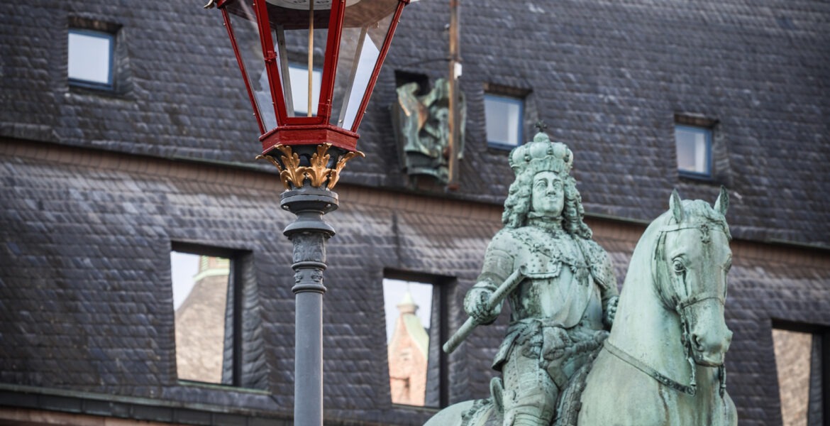 Das hat er verdient: Unser Jan Wellem wird jetzt von vier prächtigen historischen Laternen beleuchtet,…