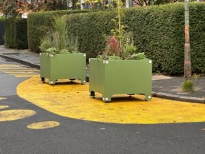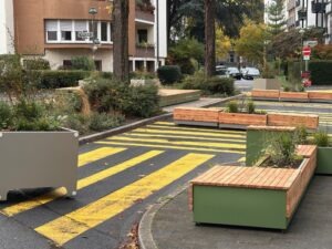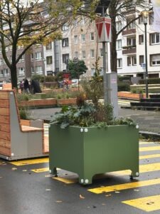 Bei meinem letzten Besuch dort, drei Wochen vor meinem Urlaub, gab es dort nur die widerlichen gelben Schmierereien. Zwischenzeitlich sind einige hässliche Blumenkübel dazu gekommen, außerdem Sitzbänke, zumindest denke ich, es könnten welche sein. Das macht den gelben Irrsinn, über den sich nach wie vor Anlieger aufregen – auch mein Patenkind war „irritiert“ – nicht besser.