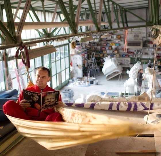 Das Bild täuscht: Jacques Tilly, hier in einer Pause in seiner Wagenbauhalle, ist derzeit unter Hochdruck – Wagen bauen für den Rosenmontag. Foto: Hojabr Riahi / Düsseldorf Blog – Fotos unten: Ricarda Hinz