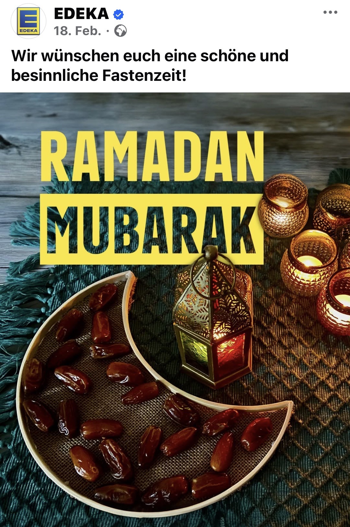 Edeka, deutscher Marktführer im Lebensmittel-Einzelhandel, gratuliert den Muslimen zum Auftakt der Ramadan-Zeit, in der Muslime von Sonnenauf- bis Sonnenuntergang weder etwas essen noch trinken dürfen (was höchst ungesund ist) und sich am Abend beim sogenannten Fastenbrechen der Völlerei hingeben (was ebenso ungesund ist).