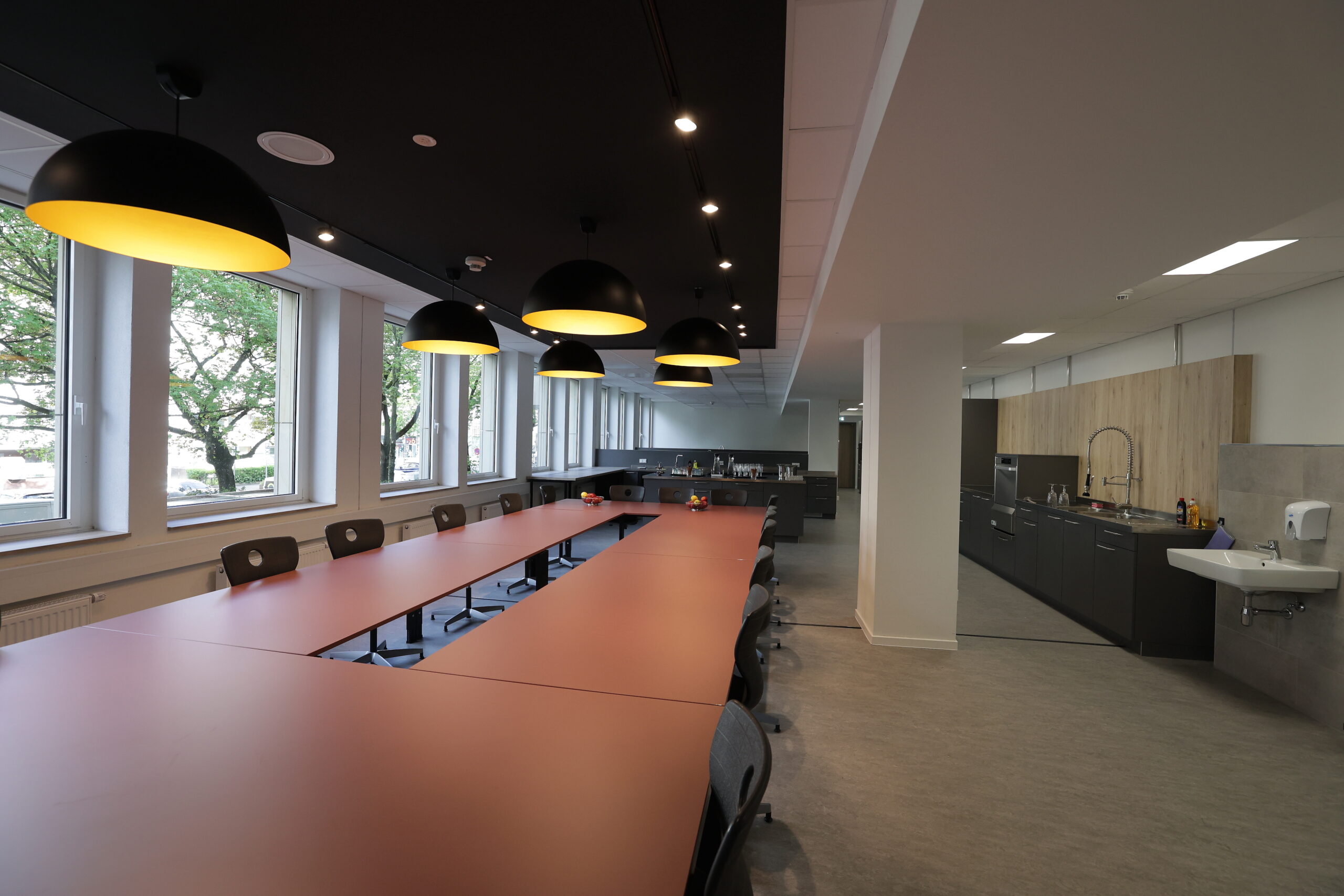 Bildungsinteressierte gelangen über einen großzügigen Eingangs- und Anmeldebereich in das Gebäude. Zwei große, multifunktionale Säle sind für besondere Veranstaltungen sowie Vorträge und Aufführungen vorgesehen. Darüber hinaus ist ein weiterer Saal für das Prüfungsangebot der VHS eingerichtet worden. Als zentrale Anlaufstelle umfasst das Erdgeschoss auch eine Cafeteria. Sie wird über einen neu geschaffenen Innenhof mit natürlichem Licht versorgt. Komfortable Sitzgelegenheiten laden zum Entspannen ein.