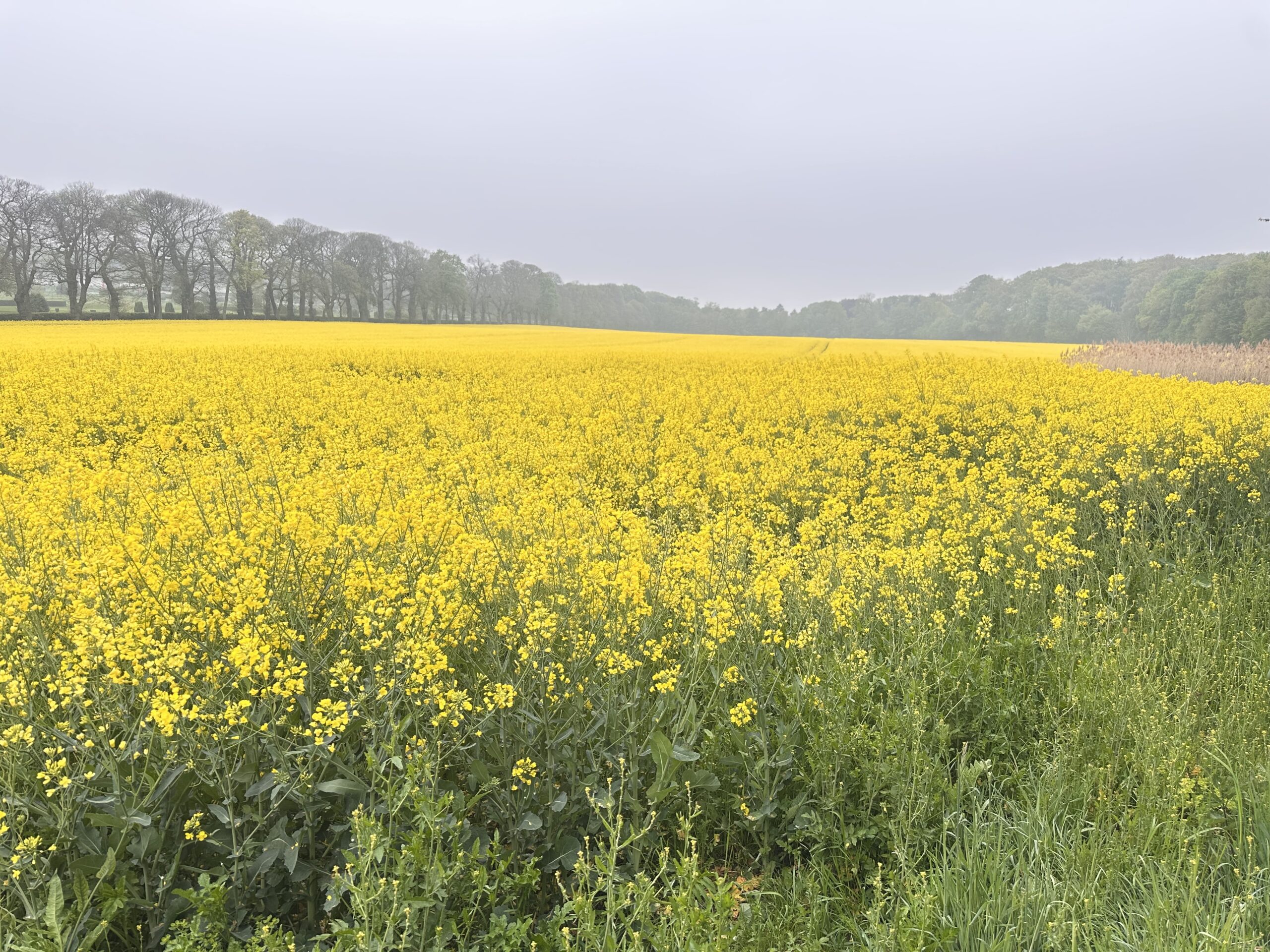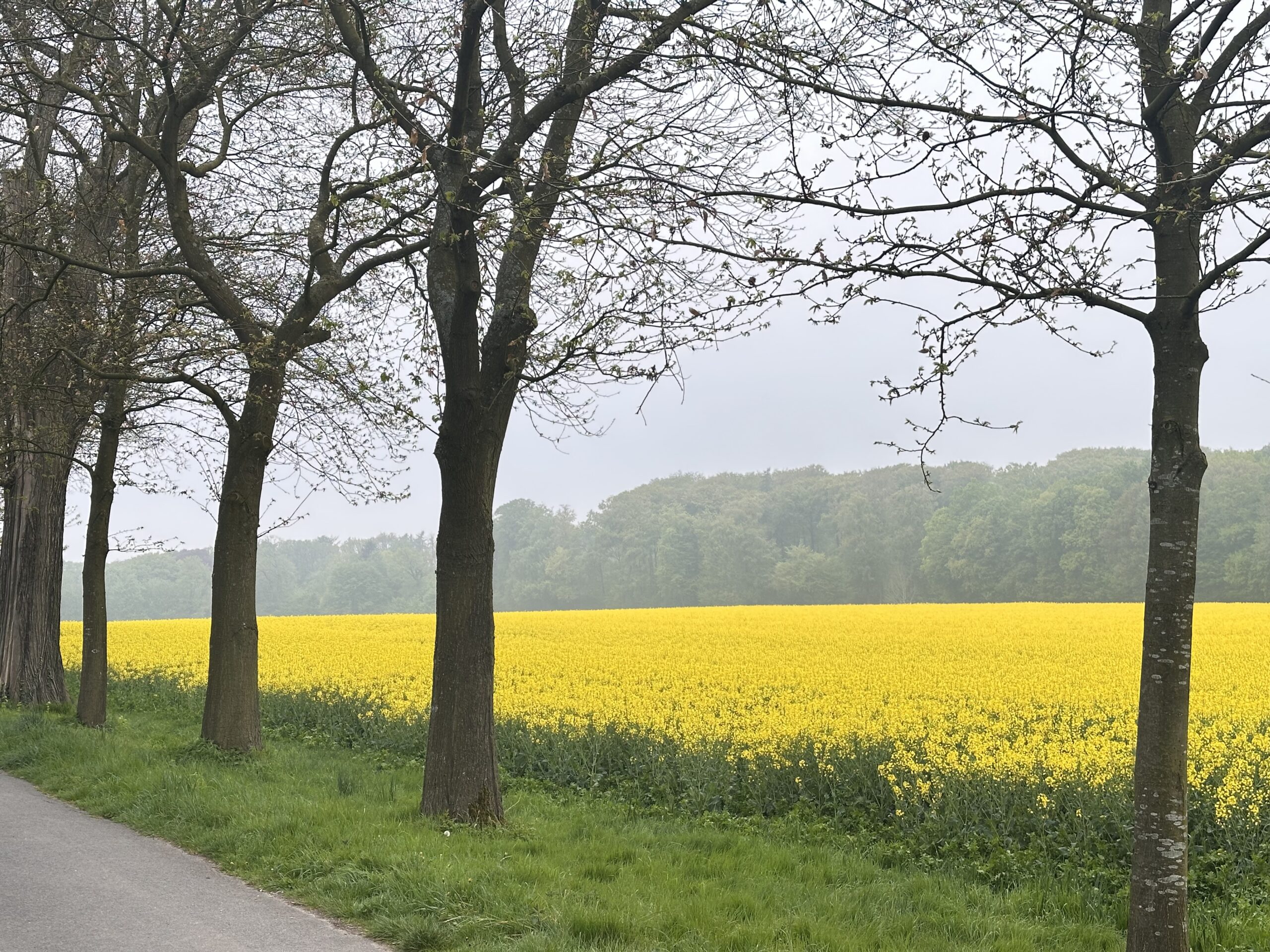 Gelb, soweit das Auge reicht. Die Rapsblüte hat das große Feld neben der Galopprennbahn Grafenberg in einen gelben Teppich verwandelt. Ein willkommener Augenurlaub für die vielen Jogger, Spaziergänger und Hunde-Ausführer, die man morgens hier antrifft.