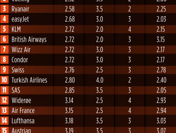 Die Finnair (Platz 1) ist der größte Verlierer. Die Grafik zeigt sowohl die schlechtesten als auch die besten Airlines. Die in Deutschland stark frequentierten TUIFly und Eurowings schneiden recht gut ab, Condor…