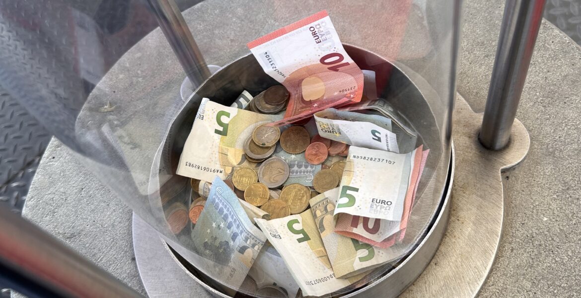 Der Trinkgeld-Behälter bei Mr. Wash an der Münsterstraße – normalerweise nur mit Münzen bestückt, gelegentlich…